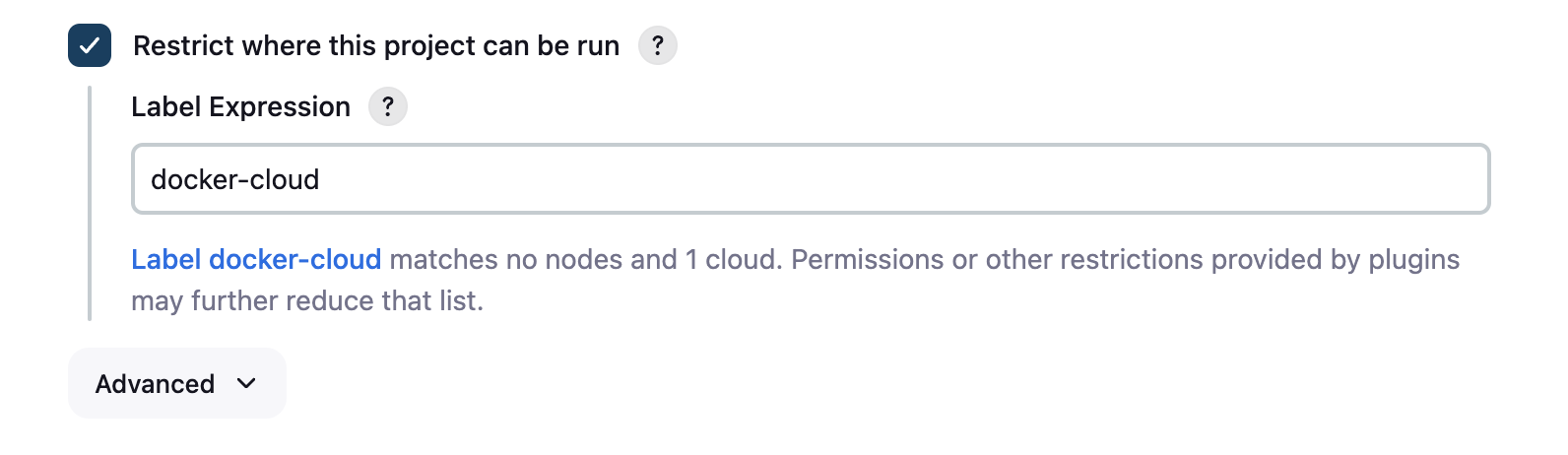 Check `Restrict where this project can be run` and set as value the name of the cloud agent you created in the previous step.